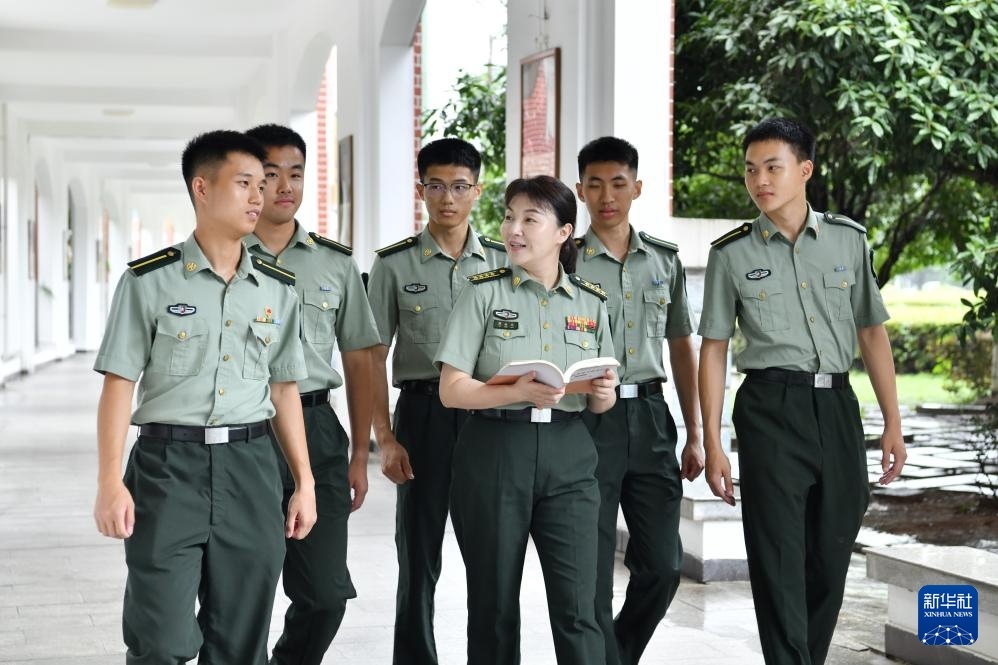 國防科技大學(xué)軍政基礎(chǔ)教育學(xué)院教授傅婉娟(右三)與學(xué)員們一起討論教材內(nèi)容 (7月22日攝)。新華社發(fā)(王驍 攝)