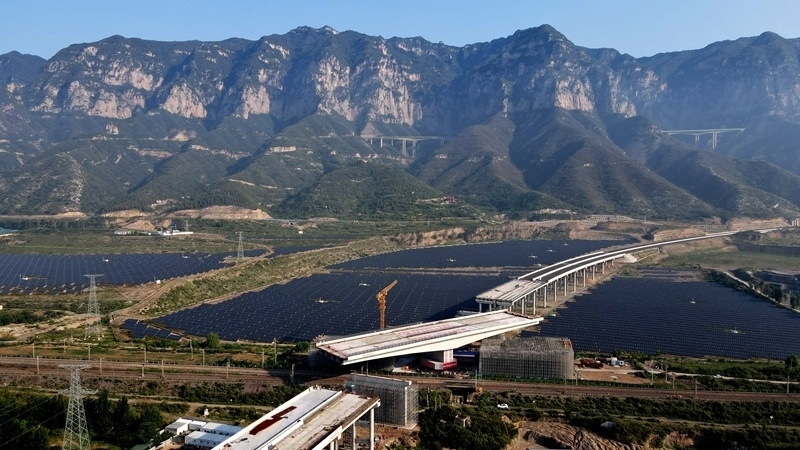 這是8月11日拍攝的河南省濟(jì)源市沿太行山高速公路跨焦柳鐵路立交橋轉(zhuǎn)體施工現(xiàn)場。