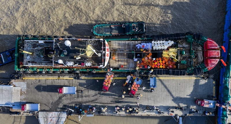 8月12日,開漁歸來的漁運船靠泊在舟山沈家門舟山國際水產城碼頭,整筐的梭子蟹被運送上岸裝車(無人機照片)。