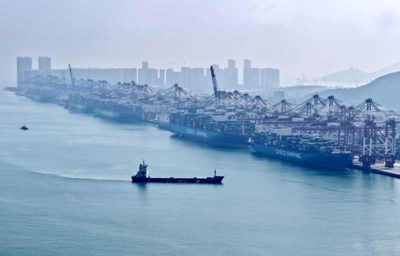 8月19日,貨輪在山東港口青島港前灣港區(qū)裝卸集裝箱(無(wú)人機(jī)照片)。