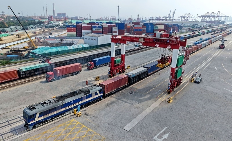 8月19日,一列裝載集裝箱的貨運(yùn)列車從山東港口青島港前灣港區(qū)海鐵聯(lián)運(yùn)中心堆場(chǎng)駛出(無(wú)人機(jī)照片)。