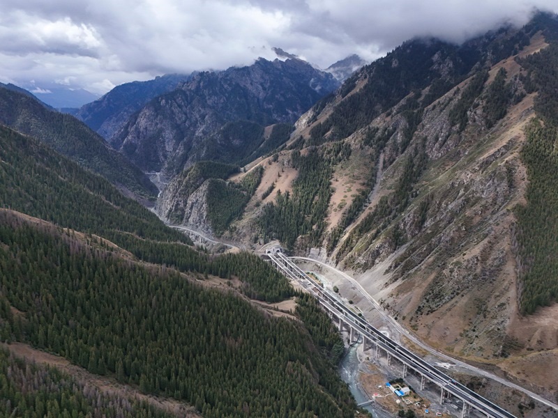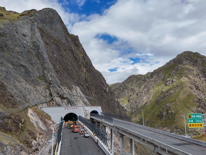 工人在新疆烏尉高速公路躍進3號隧道南端施工(8月19日攝,無人機照片)。