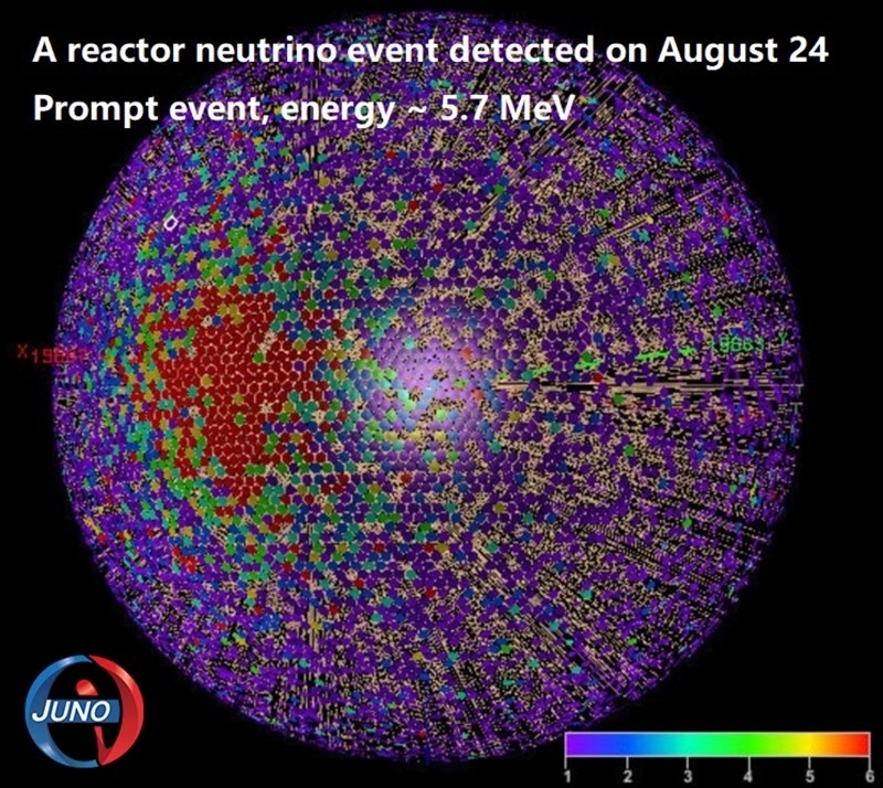 這是8月24日江門中微子實(shí)驗(yàn)探測(cè)到的一個(gè)反應(yīng)堆中微子事例示意圖。