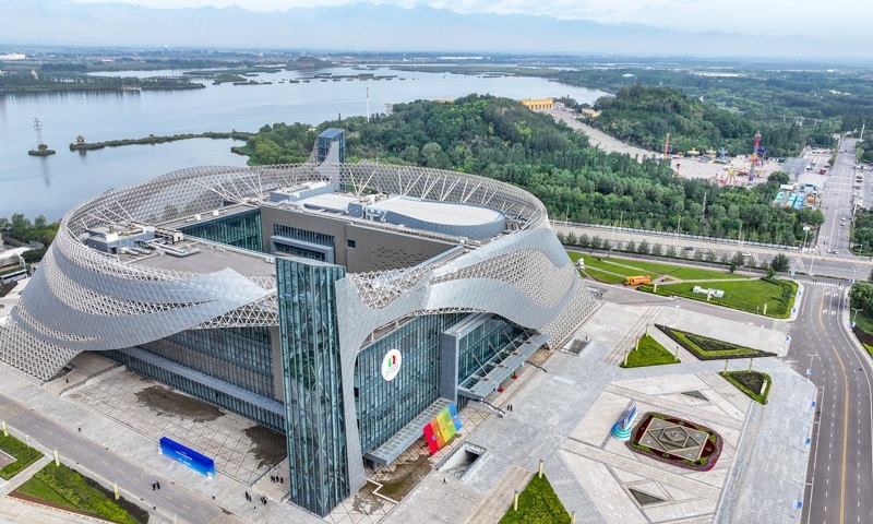 這是8月28日在寧夏銀川市拍攝的第七屆中國(guó)—阿拉伯國(guó)家博覽會(huì)開(kāi)幕式舉辦地——寧夏國(guó)際會(huì)堂外景(無(wú)人機(jī)照片)。