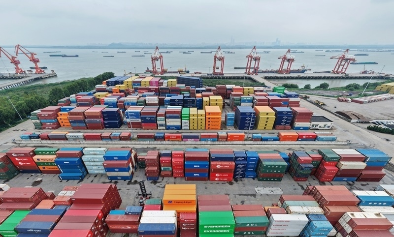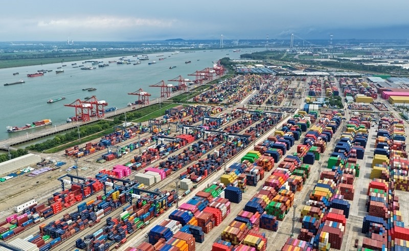 9月8日拍攝的江蘇省揚州港集裝箱堆場(無人機照片)。