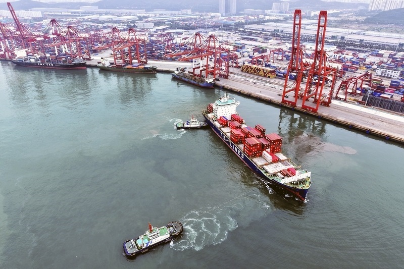 9月8日,在山東港口集團青島港,一艘裝載外貿(mào)集裝箱的貨輪駛離泊位(無人機照片)。