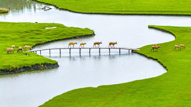 10月17日,在江蘇省泰州市姜堰區(qū)溱湖國家濕地公園,一群麋鹿通過獨木橋(無人機照片)。