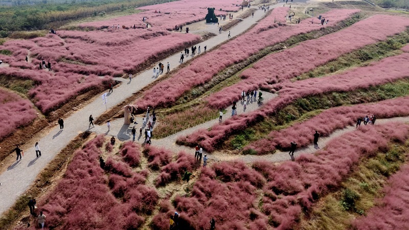 10月18日,游客在山東省臨沂市平邑縣柏林鎮(zhèn)粉黛亂子草花田游玩(無人機照片)。