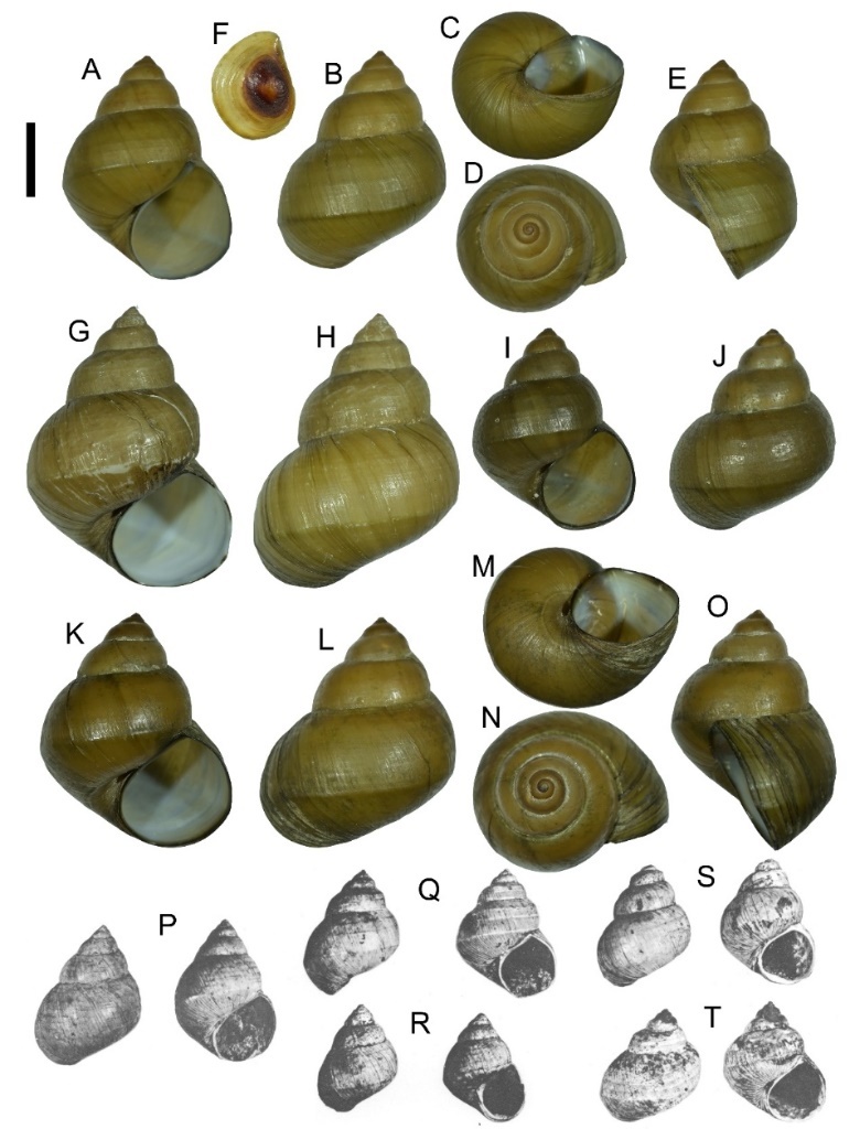 李四光婭田螺的現(xiàn)生個(gè)體貝殼(A—O)以及發(fā)現(xiàn)于第四紀(jì)沉積層的貝殼模式標(biāo)本(P—T)。(中國科學(xué)院昆明動(dòng)物研究所東南亞野生動(dòng)物多樣性課題組供圖)