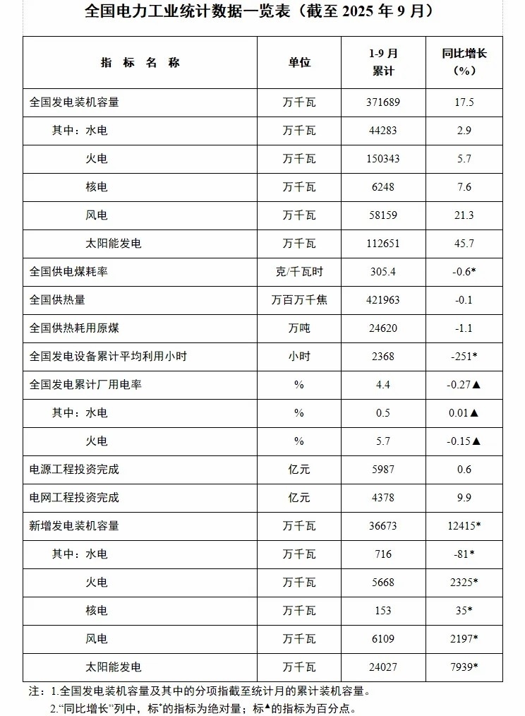 據(jù)“國(guó)家能源局”微信公眾號(hào)消息,10月26日,國(guó)家能源局發(fā)布1-9月份全國(guó)電力工業(yè)統(tǒng)計(jì)數(shù)據(jù)。