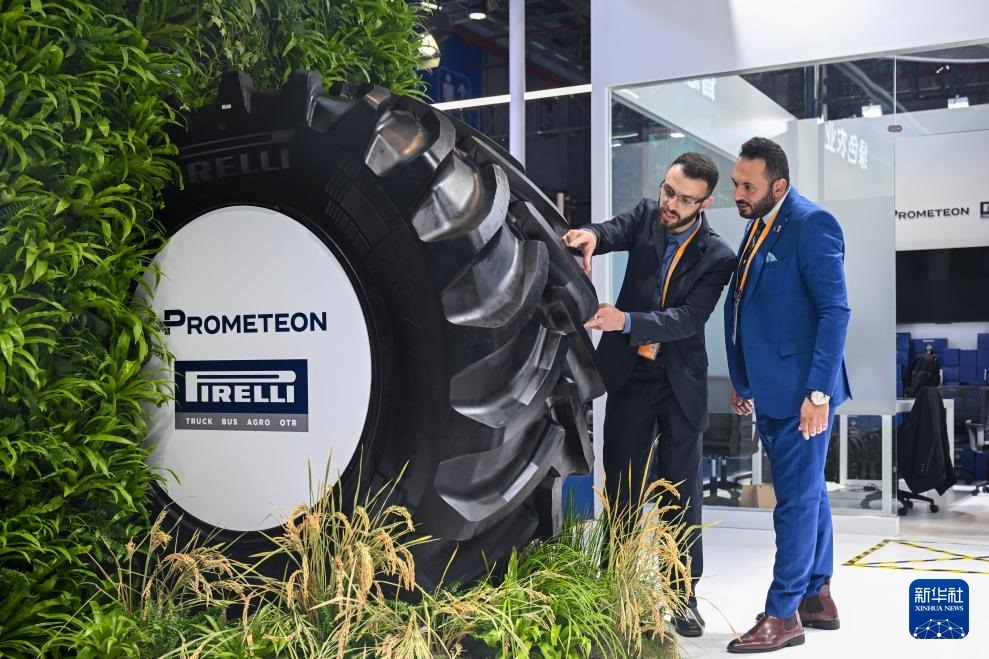 11月6日,在進(jìn)博會汽車及智慧出行展區(qū)百得安輪胎集團展臺,展商在亞洲首發(fā)產(chǎn)品綠色農(nóng)業(yè)輪胎AT02前交流。