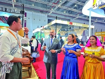 第八屆進博會老撾展廳,工作人員邀請薩爾瓦多游客品茶。本報記者 范天培攝/光明圖片