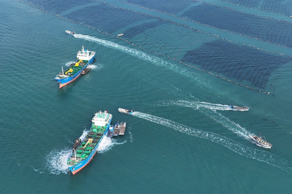 ↑ 11月11日,在山東省榮成市愛(ài)倫灣海洋牧場(chǎng),運(yùn)鮮船在裝運(yùn)鮑魚南下福建越冬(無(wú)人機(jī)照片)。新華社發(fā)(王福東 攝)
