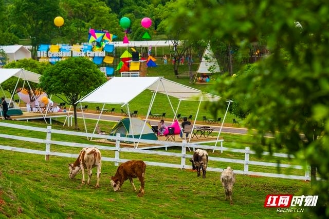 在景區(qū)內(nèi)看到,幾頭黃牛在圍欄內(nèi)悠閑踱步,遠(yuǎn)處白色帳篷點(diǎn)綴草地,彩色氣球懸空,標(biāo)識(shí)牌上寫著“草原音樂狂歡節(jié)”。這一幕,成為景區(qū)從“田園牧歌”走向“時(shí)尚秀場(chǎng)”的縮影。