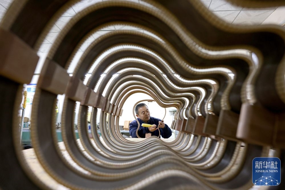 ↑ 12月15日,在山東省棗莊市市中區(qū)孟莊鎮(zhèn)一家吉他生產企業(yè),技術工人在生產吉他。新華社發(fā)(孫中喆攝)