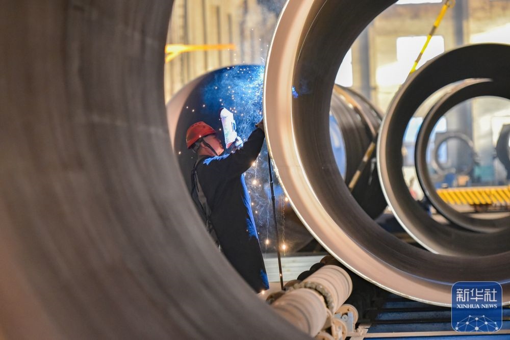 ↑ 12月15日,在山東省青州市益都街道一家大型風電設備制造企業(yè),工人在車間內進行焊接作業(yè)。新華社發(fā)(王繼林攝)