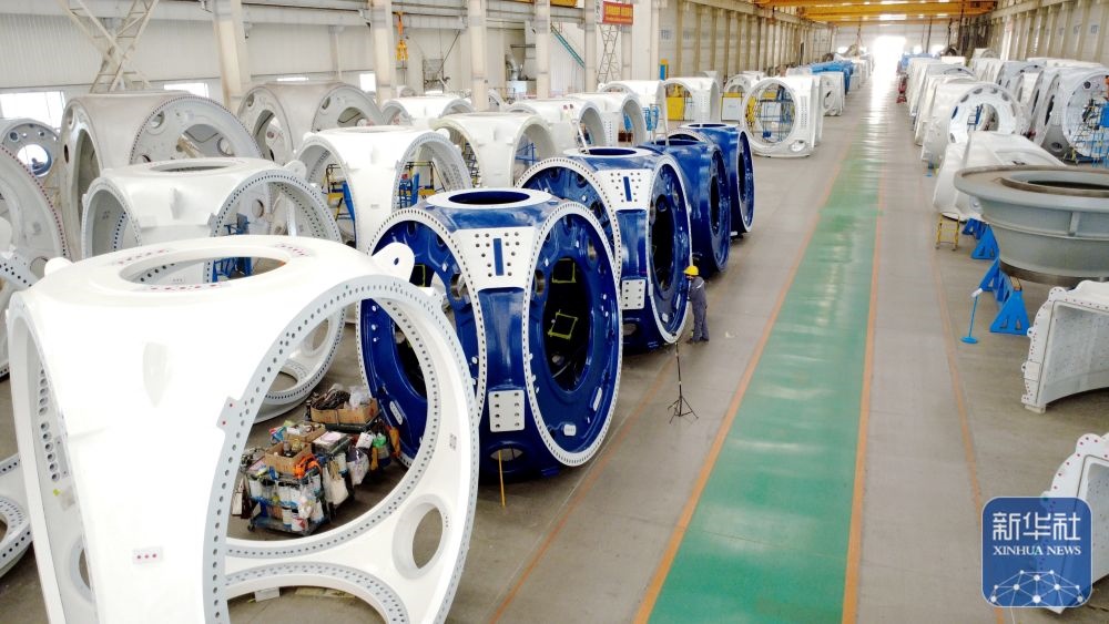 ↑ 12月15日,工人在山東省濱州市惠民經(jīng)濟開發(fā)區(qū)風電裝備產業(yè)園的車間清理風電輪轂(無人機照片)。新華社發(fā)(王軍攝)
