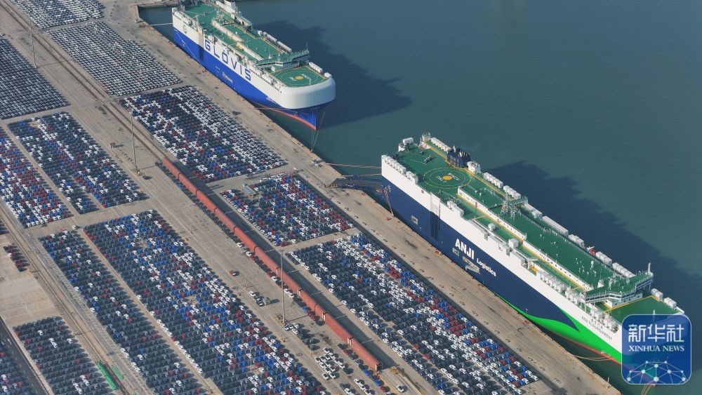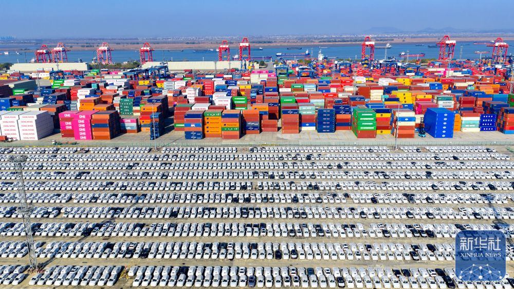↑ 12月14日在江蘇省港口集團南京港龍?zhí)都b箱碼頭拍攝的等待裝船出口的國產汽車(無人機照片)。新華社發(fā)(楊素平攝)