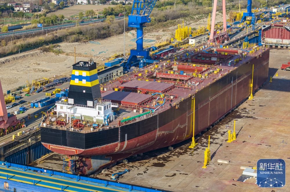 ↑ 12月15日,在江蘇南京招商工業(yè)南京金陵船廠生產廠區(qū),大型船舶在建造中(無人機照片)。新華社發(fā)(辛一攝)