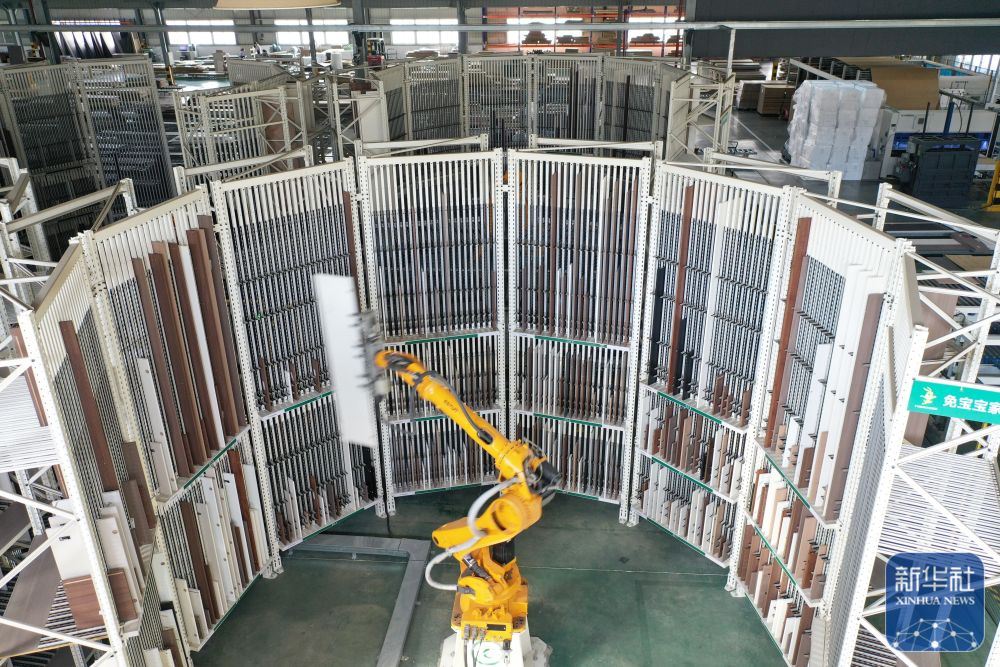 ↑ 12月15日,在位于浙江省湖州市德清縣乾元鎮(zhèn)的德華兔寶寶裝飾新材股份有限公司家居產業(yè)園,智能分揀機械臂在分揀家具板材(無人機照片)。新華社發(fā)(倪立芳攝)