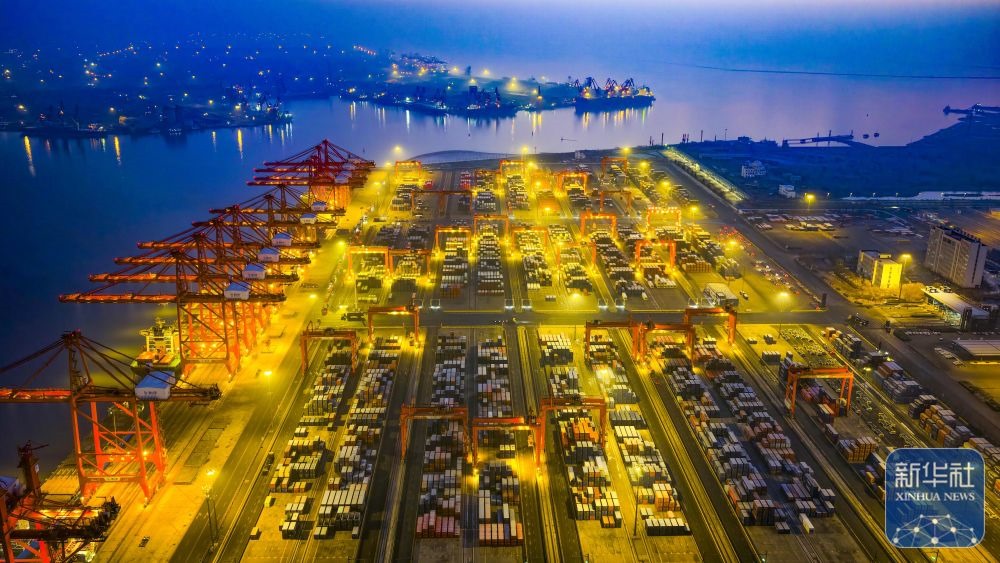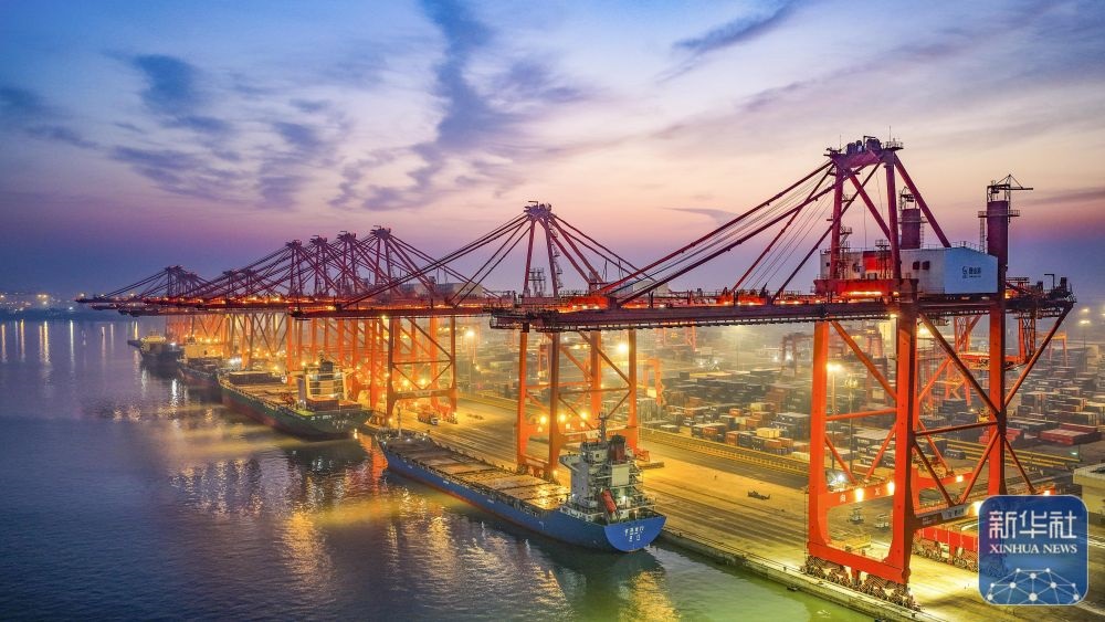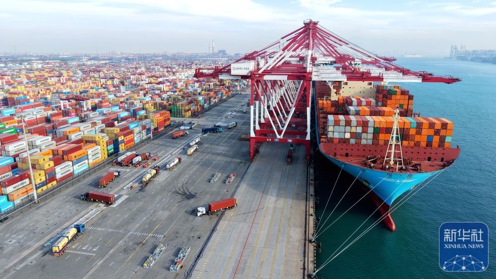 ↑ 12月15日,在山東港口青島港,貨輪在裝卸外貿集裝箱(無人機照片)。新華社發(fā)(俞方平攝)