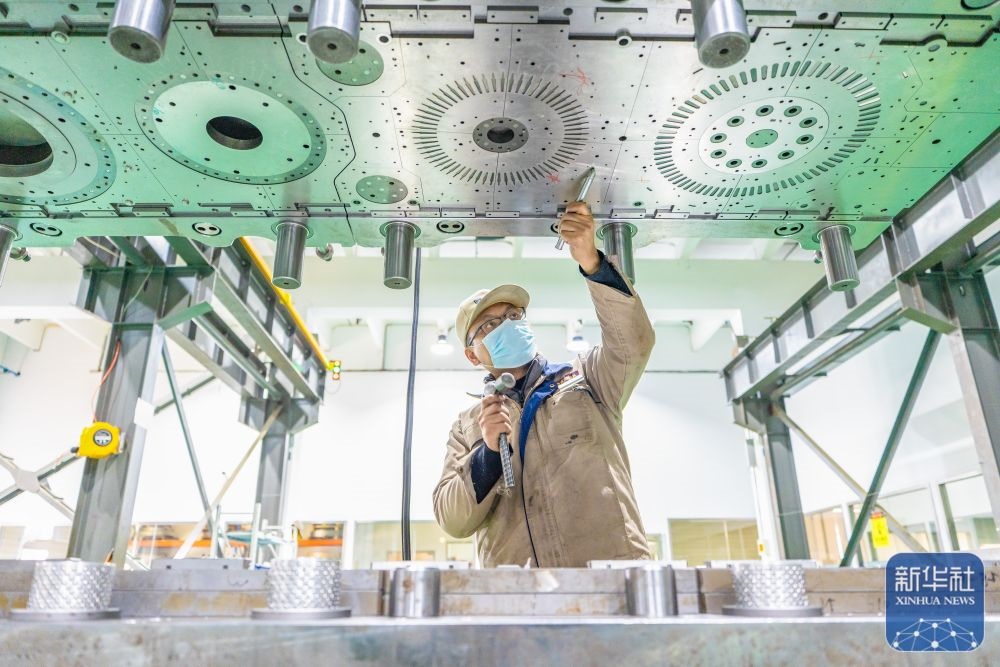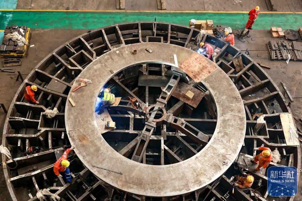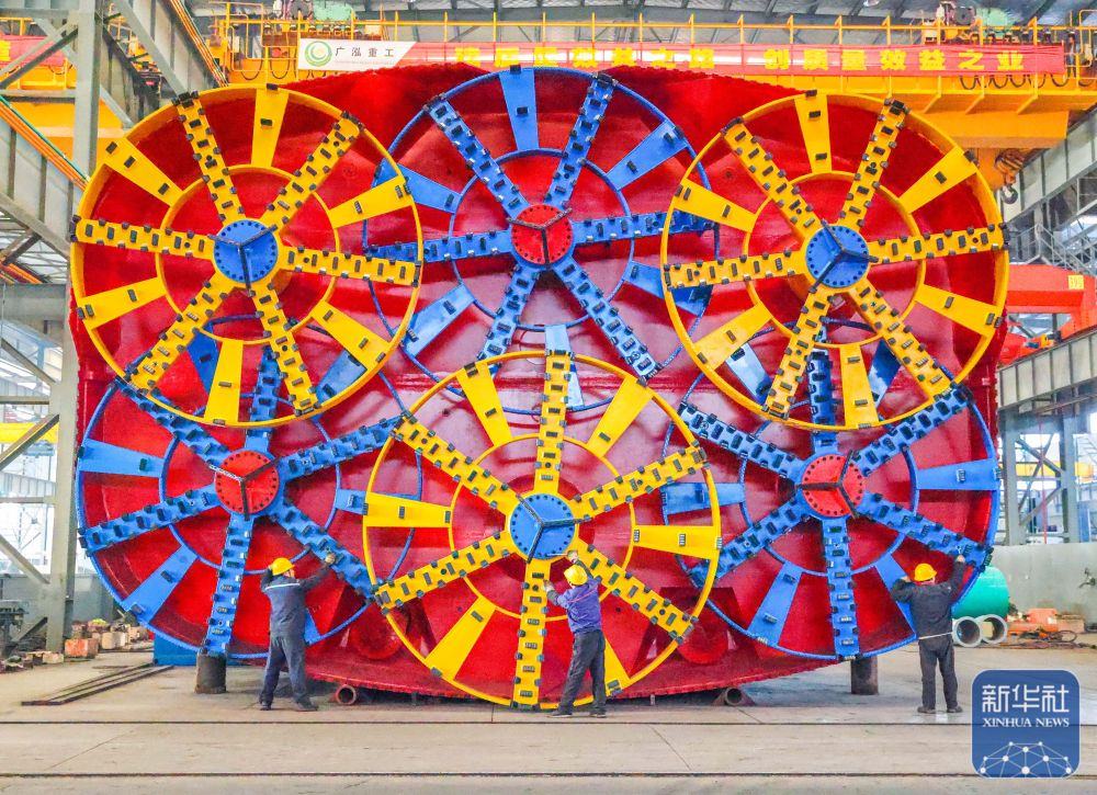 ↑ 12月15日,中鐵科工集團武漢江夏制造基地技術工人對盾構機配件進行裝配作業(yè)。新華社發(fā)(趙軍攝)
