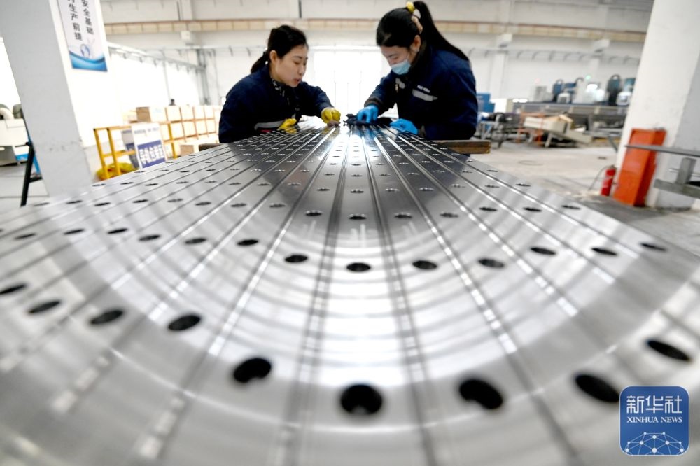 ↑ 12月15日,在位于江蘇省南通市通州區(qū)興仁鎮(zhèn)的江蘇富松模具科技有限公司車間內,工人趕制模具產品訂單。新華社發(fā)(翟慧勇攝)