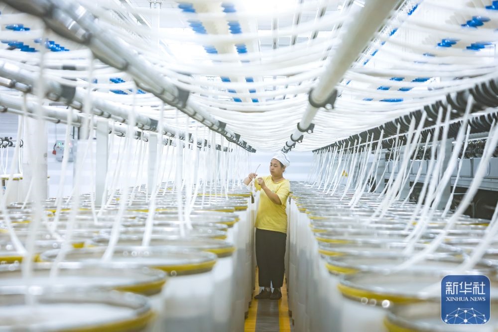 ↑ 12月15日,工人在江蘇省泰州市姜堰區(qū)三水街道江蘇泰達紡織科技有限公司智慧紡紗車間忙碌作業(yè)。新華社發(fā)(顧繼紅攝)