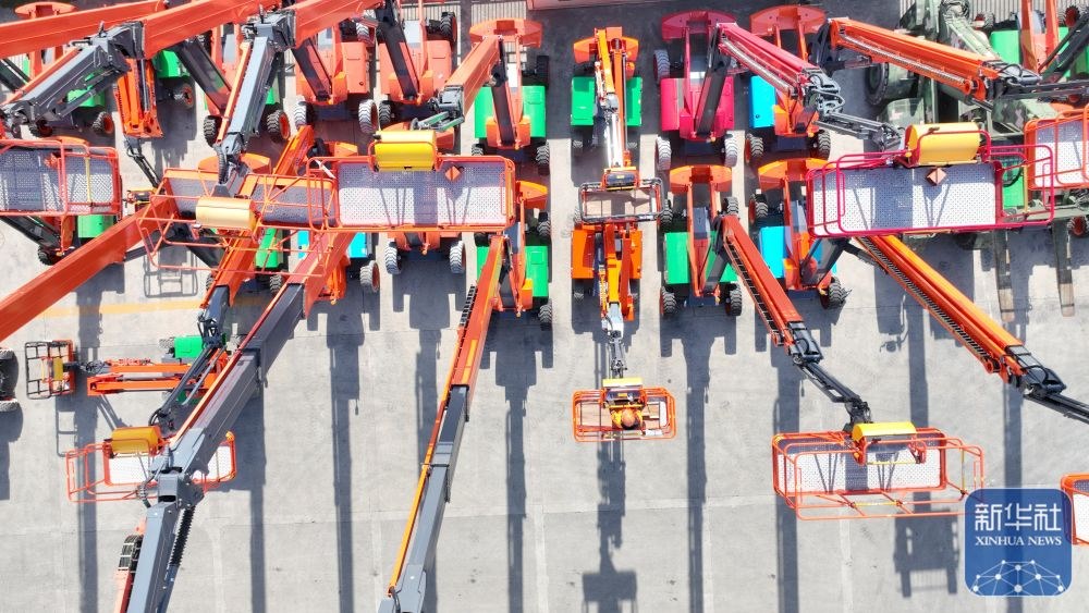 ↑ 12月15日,在位于浙江省湖州市德清縣雷甸鎮(zhèn)的浙江鼎力機械股份有限公司,工人對準備出口的新臂式智能高空作業(yè)平臺設備進行檢測(無人機照片)。新華社發(fā)(謝尚國攝)