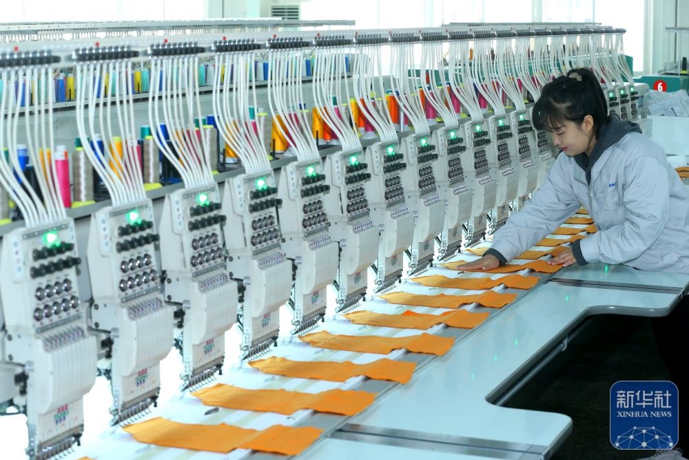 ↑ 12月15日,山東省青島市即墨區(qū)即發(fā)集團員工在生產服裝繡花產品。新華社發(fā)(梁孝鵬攝)