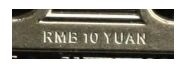 在硬幣正面面額數(shù)字“10”的底端,可觀察到“RMB 10 YUAN”的微縮文字。防偽特征效果見圖4。