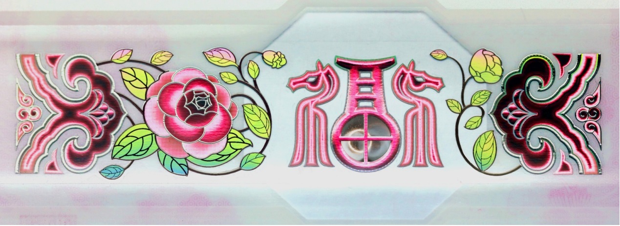 位于票面下方。改變觀察角度,票面正面可見“如意云紋”、“山茶花”與“福”字組成的裝飾紋樣呈現(xiàn)多色動感特征。“?!弊窒虏俊疤铩弊謨?nèi)可見立體動感高亮圓環(huán)效果。防偽特征效果見圖6。