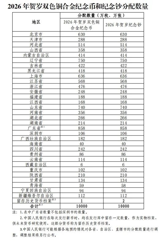 2026年1月12日前,中國人民銀行分支機構(gòu)將向社會公告當(dāng)?shù)?026年賀歲雙色銅合金紀(jì)念幣和紀(jì)念鈔的分配數(shù)量等信息。承辦銀行將在其官方網(wǎng)站公布2026年賀歲雙色銅合金紀(jì)念幣和紀(jì)念鈔預(yù)約兌換網(wǎng)點及每個網(wǎng)點的可預(yù)約數(shù)量等信息。