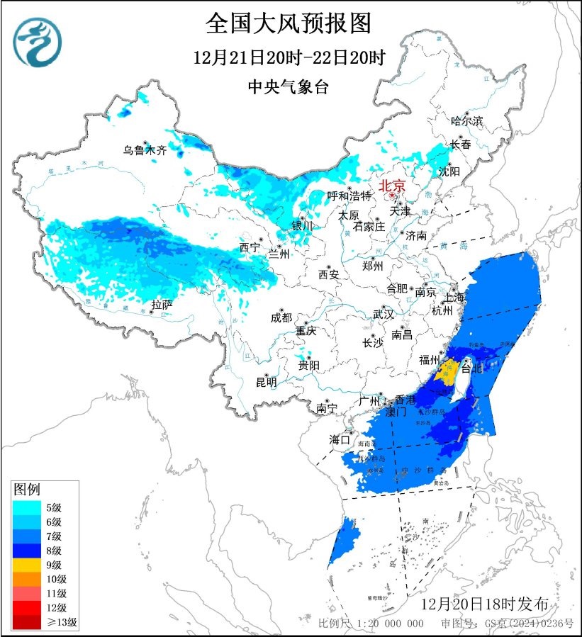 12月21日20時至22日20時,內(nèi)蒙古中西部、東北地區(qū)南部、華北北部、新疆北疆東部、西藏北部、青海中南部等地有5~6級風(fēng),陣風(fēng)7~9級;東海大部海域、臺灣海峽、臺灣以東洋面、巴士海峽、南海北部和中部海域?qū)⒂?~8級、陣風(fēng)9~10級的大風(fēng),其中臺灣海峽的風(fēng)力可達(dá)9級、陣風(fēng)10~11級。