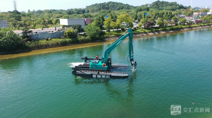 只見一臺(tái)身披“山河綠”的水陸兩棲挖掘機(jī)穩(wěn)穩(wěn)地在水中行駛。駕駛室里的工程師輕拉搖桿,這個(gè)足有兩層樓高的“鋼鐵巨獸”便靈活轉(zhuǎn)身,履帶劃過水面,泛起層層漣漪——輕巧的身姿完全顛覆了人們對(duì)挖掘機(jī)“只能在地上笨重行走”的固有印象。