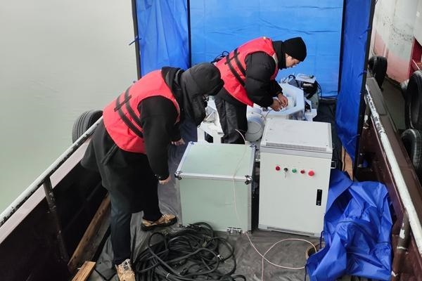 團(tuán)隊(duì)成員冒著嚴(yán)寒在湖上調(diào)試設(shè)備。
