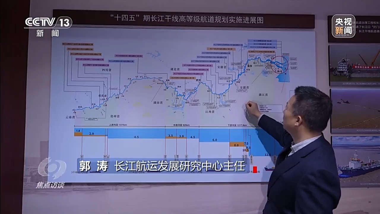 郭濤:十年前,因?yàn)榫植康亩曼c(diǎn)卡點(diǎn),航道標(biāo)準(zhǔn)不能統(tǒng)一,水深沒(méi)法貫通起來(lái)。通過(guò)十年的整治和疏浚,水深明顯提升了,可以通航的船舶更大了,物流成本就更低了。
