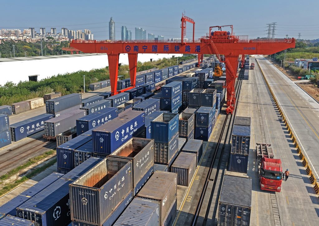 近日,記者從國(guó)鐵南寧局獲悉,2025年西部陸海新通道班列發(fā)運(yùn)集裝箱貨物142.5萬(wàn)標(biāo)箱,同比增長(zhǎng)47.6%,首次實(shí)現(xiàn)年發(fā)運(yùn)量突破百萬(wàn)標(biāo)箱,再創(chuàng)歷史新高。新華社記者 周華 攝