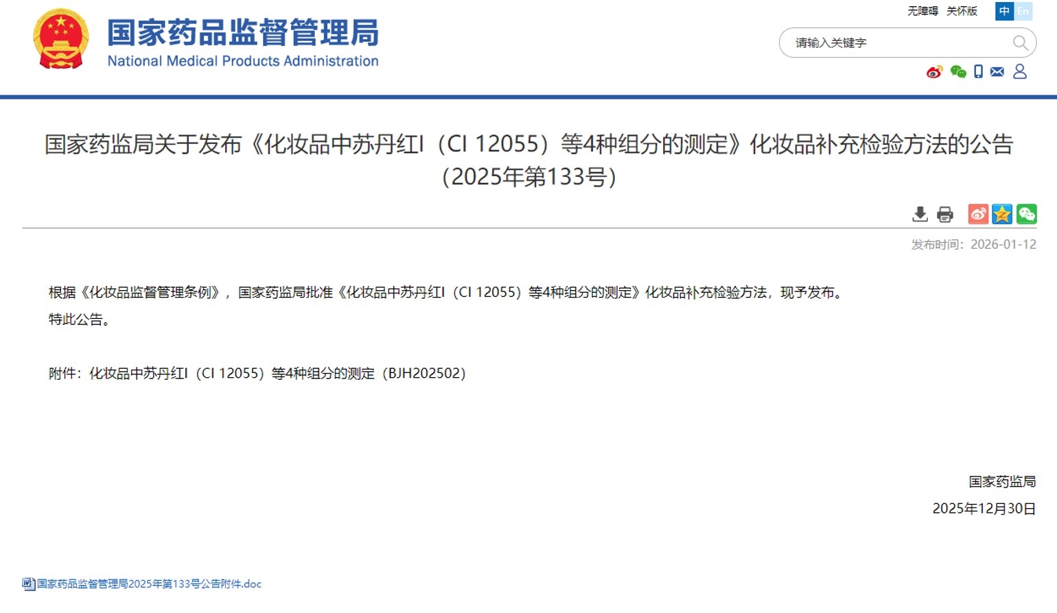 中新網(wǎng)北京1月13日電(記者 左雨晴) 國家藥監(jiān)局近日批準《化妝品中蘇丹紅I(CI 12055)等4種組分的測定》化妝品補充檢驗方法,該方法適用于液體(水、油)類、膏霜乳類、粉劑類、塊狀類、蠟基類化妝品中蘇丹紅Ⅰ、蘇丹紅Ⅱ、蘇丹紅Ⅲ、蘇丹紅Ⅳ的含量測定。