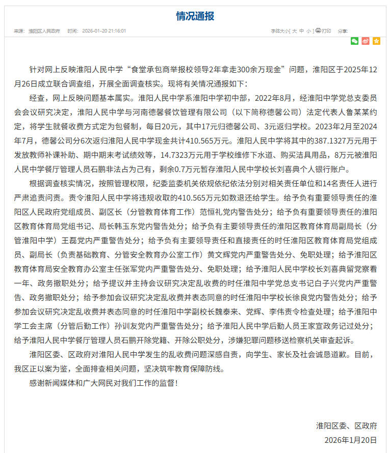 中新網(wǎng)1月21日電 據(jù)周口市淮陽(yáng)區(qū)人民政府官網(wǎng)消息,近日,淮陽(yáng)區(qū)委、區(qū)政府發(fā)布通告表示,針對(duì)網(wǎng)上反映淮陽(yáng)人民中學(xué)“食堂承包商舉報(bào)校領(lǐng)導(dǎo)2年拿走300余萬(wàn)現(xiàn)金”問(wèn)題,淮陽(yáng)區(qū)于2025年12月26日成立聯(lián)合調(diào)查組,開(kāi)展全面調(diào)查核實(shí)?,F(xiàn)將有關(guān)情況通報(bào)如下: