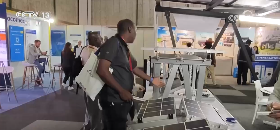 這個(gè)新能源產(chǎn)品可以說(shuō)是非常具有非洲特色,它的上面是兩片光伏板,下面是兩個(gè)可以調(diào)整角度的攝像頭,用光伏發(fā)電來(lái)支持?jǐn)z像頭的運(yùn)行,還有把路燈、攝像頭和光伏結(jié)合在一起的。
