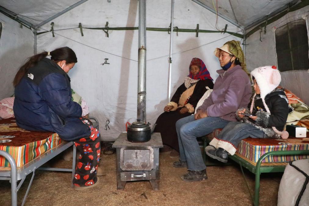 1月26日晚,在甘南州迭部縣電尕鎮(zhèn)哇曲村臨時安置點,群眾在應(yīng)急帳篷內(nèi)取暖休息。 (新華社記者張智敏 攝)