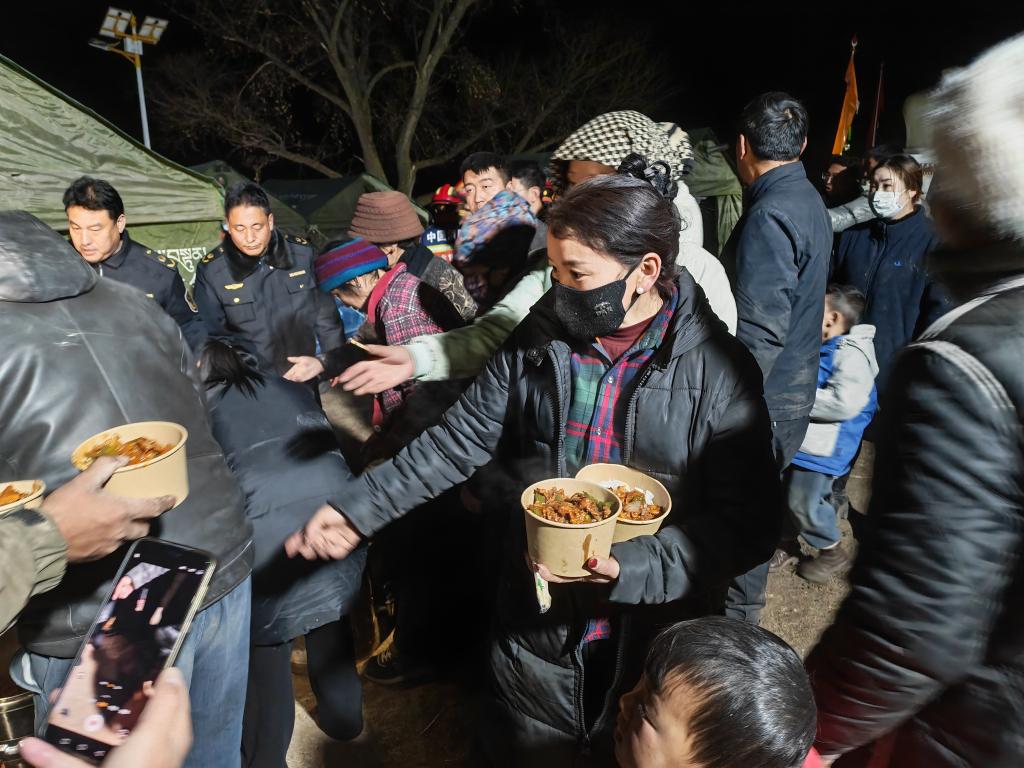 1月26日晚,在甘南州迭部縣電尕鎮(zhèn)哇曲村臨時安置點,群眾正在領(lǐng)取愛心餐食。(新華社記者崔翰超 攝)