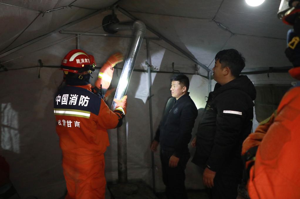 1月26日晚,在甘南州迭部縣電尕鎮(zhèn)哇曲村臨時安置點,消防救援人員在應(yīng)急帳篷內(nèi)幫助群眾安裝煤爐煙筒。 (新華社記者張智敏 攝)
