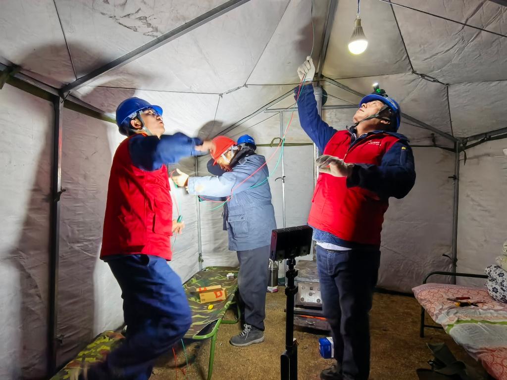 1月26日晚,國網(wǎng)甘南供電公司工作人員為臨時安置點應(yīng)急帳篷接電。(國網(wǎng)甘南供電公司供圖)