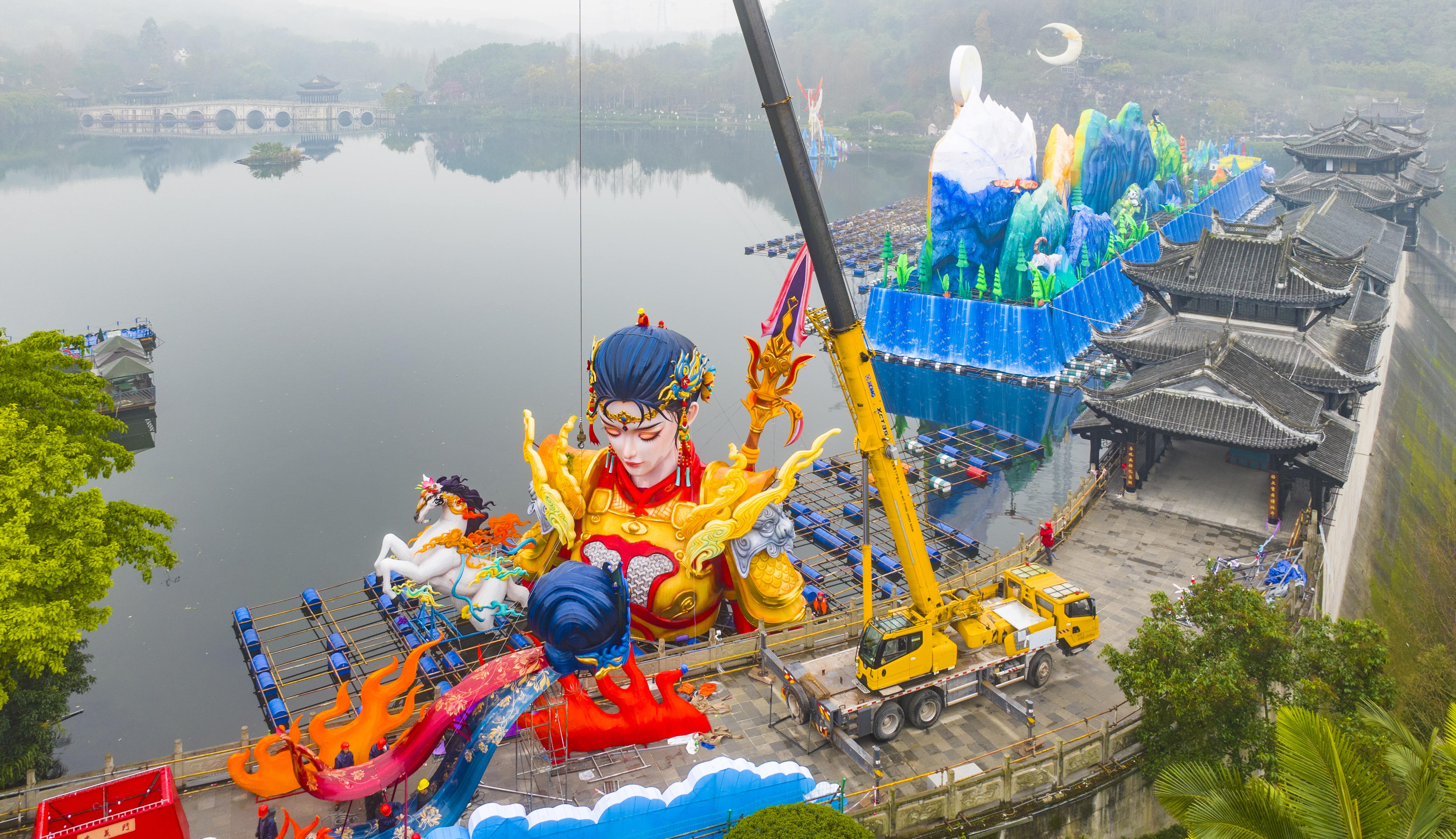 ▲2026重慶市新春燈會(huì)——“禧歡霓”園博園大型水上燈會(huì),工人們正在抓緊搭建《巾幗良玉》燈組。記者 齊嵐森 攝/視覺(jué)重慶