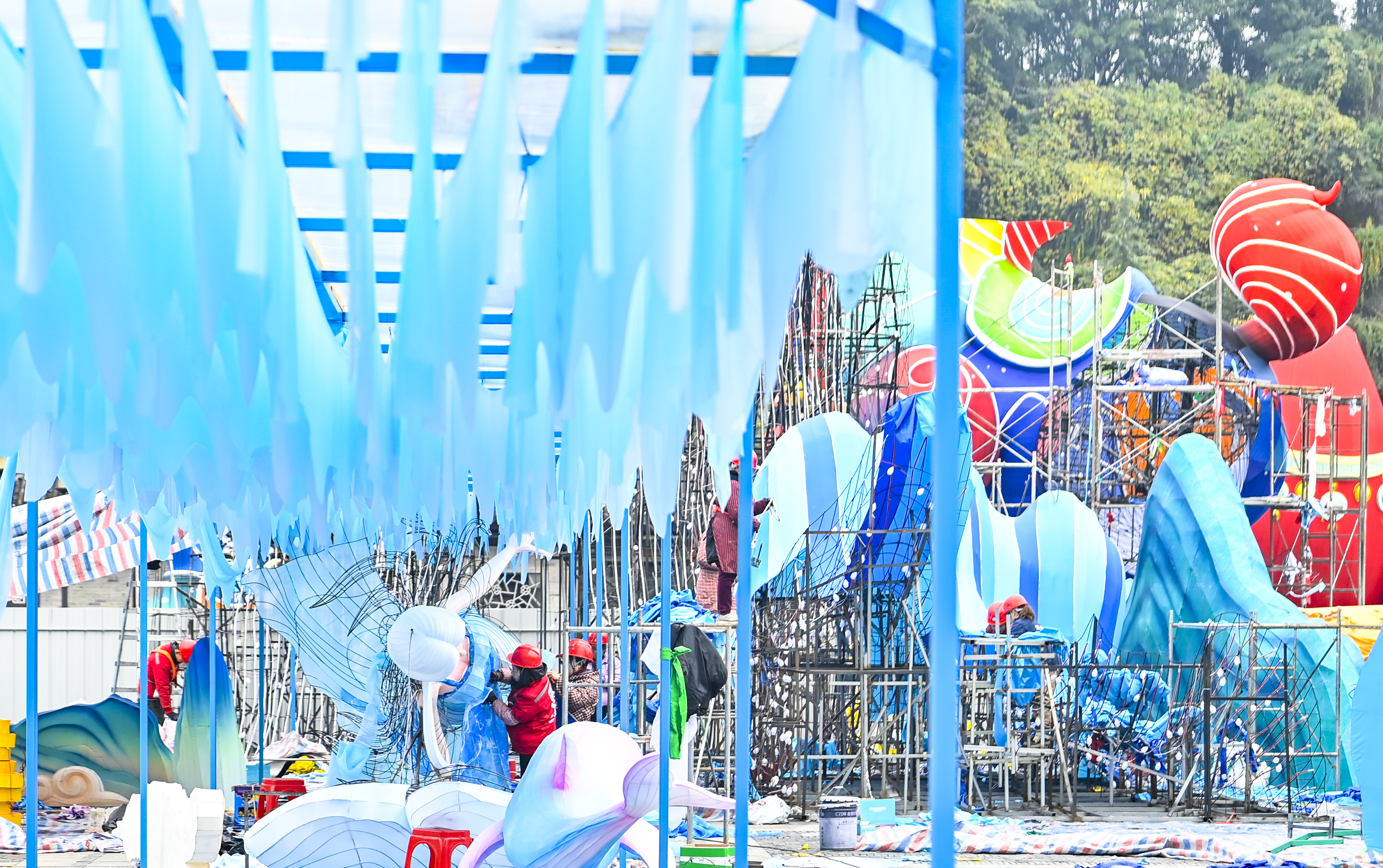 ▲2026重慶市新春燈會(huì)——“禧歡霓”園博園大型水上燈會(huì)現(xiàn)場(chǎng),工人正加緊搭建各種造型的彩燈。記者 齊嵐森 攝/視覺(jué)重慶