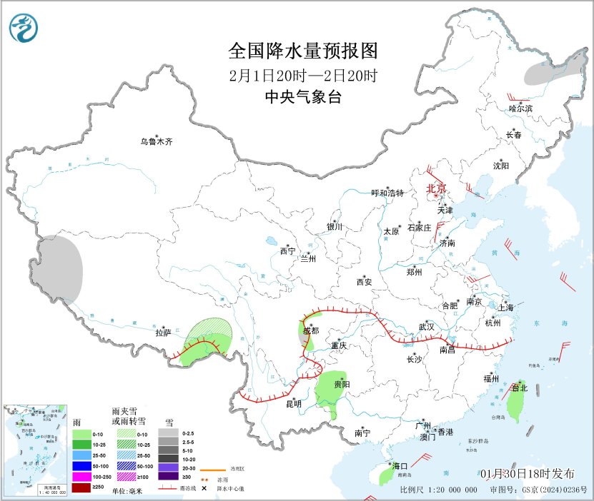 1月30日20時(shí)至31日20時(shí),內(nèi)蒙古中東部、新疆南疆西部山區(qū)、西藏西部、青海北部和東部、川西高原北部、甘肅河西和南部、黑龍江北部、遼寧中南部、江淮中東部、江漢西部及湖南西部、貴州東北部等地部分地區(qū)有小雪或雨夾雪,其中,新疆南疆西部山區(qū)、安徽南部、湖南西部、貴州東北部等地部分地區(qū)有中到大雪(5~9毫米);貴州西部和東南部、湖南南部等地高海拔山區(qū)局地有凍雨。江淮西部、江南大部、西南地區(qū)東部、華南大部、臺(tái)灣島等地部分地區(qū)有小雨,其中,江西東北部、浙江中北部等地部分地區(qū)有中雨。內(nèi)蒙古中東部、遼東半島、山東半島等地部分地區(qū)有4~5級(jí)風(fēng);東海南部海域、臺(tái)灣海峽、臺(tái)灣以東洋面、巴士海峽、南海東北部海域?qū)⒂?~7級(jí)風(fēng)、陣風(fēng)8級(jí)(見(jiàn)圖1)。
