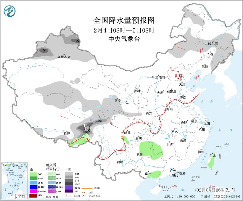 2月4日08時(shí)至5日08時(shí),內(nèi)蒙古東北部、東北地區(qū)中東部、新疆北疆大部和南疆盆地東南部、西藏南部和東部、青海中南部、甘肅南部等地部分地區(qū)有小雪或雨夾雪,其中,新疆北疆東部和伊犁河谷、西藏東部等地部分地區(qū)有中到大雪,局地暴雪(10~15毫米)。四川盆地西南部、貴州東部、湖南西部、廣西東南部、廣東西南部、臺(tái)灣島大部等地部分地區(qū)有小雨。內(nèi)蒙古東南部和中部、河北北部、西藏北部、川西高原北部等地部分地區(qū)有4~5級(jí)風(fēng),陣風(fēng)6~7級(jí),南海東北部將有5~7級(jí)風(fēng)、陣風(fēng)8級(jí)。