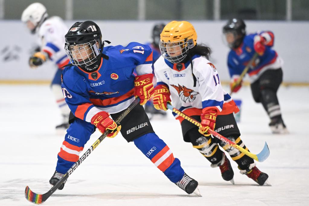1月25日,在齊齊哈爾市的黑龍?bào)w育館內(nèi),二馬路小學(xué)翼虎冰球隊(duì)隊(duì)員劉金梓晨(左)在訓(xùn)練中。新華社記者 張濤 攝